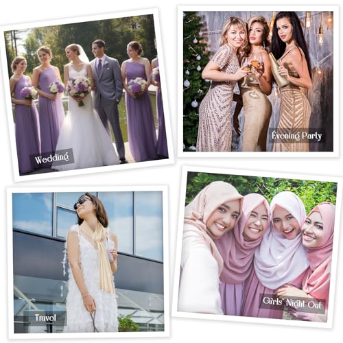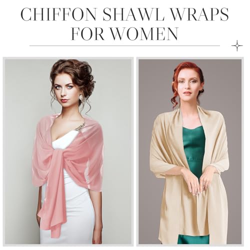 Fabric type: ChiffonOrigin: ImportedSoft and Breathable Chiffon: crafted from fine polyester chiffon, this chiffon shawl is featherlight, silky smooth, and comfortable against the skin; The breathable, quick-drying fabric ensures comfort in all weather, keeping you cool in the summer and cozy on breezy eveningsElegant for Every Occasion: this chiffon shawl is suitable for every occasion, from weddings and anniversaries to casual outings; It adds a touch of sophistication and elegance, making it the suitable accessory for formal events, date nights, or even everyday wear; It also makes a cherished giftThoughtful Gift: this shawl is ideal for brides, bridesmaids, mothers, and friends; Designed for brides, bridesmaids, weddings, mothers of the bride, or any formal event, its versatile design makes it a thoughtful gift for birthdays, holidays, or special occasions; It pairs beautifully with dresses, gowns, and evening gowns, creating a charming accessory; It's a memorable and stylish keepsakeSize and Quantity: you will receive 3 pcs chiffon shawls, one each in Light champagne, gray and pink; This generous shawl measures 79 inches x 19 inches and offers a draped, fully covered shoulder area; Its universal fit accommodates most body types and can be worn as a scarf, shawl, or stylish cover-up, ensuring a chic look year-roundEndless Styling Possibilities: our chiffon shawl can be draped, knotted, twisted, or worn as a headscarf to suit your style needs; It can be worn as a sunshade, a travel accessory, or layered with jackets and dresses; It's the suitable complement to evening gowns, wedding dresses, bridesmaid dresses, cocktail dresses, prom dresses, party dresses, homecoming dresses, and long beach gowns for a stylish and sophisticated look Perfect for everyday use. finest materials and excellent craftsmanship ensure long-lasting durability.